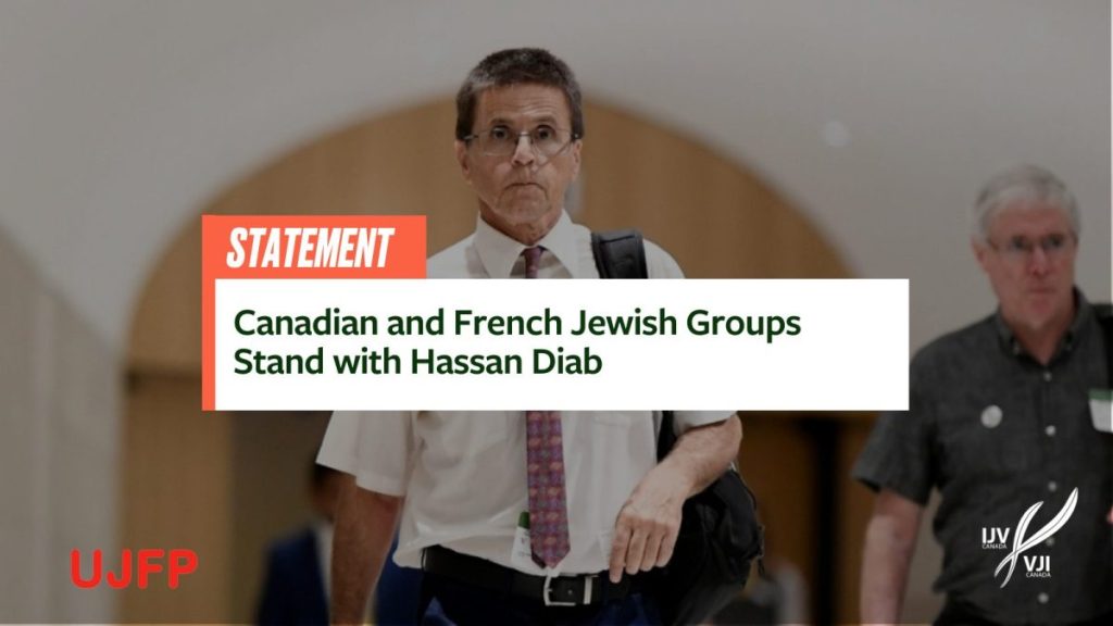 Independent Jewish Voices Canada (IJV) and l’Union juive française pour la paix (UJFP) support Dr. Hassan Diab fully. With other progressive organizations we demand the Canadian government not bow to France’s demand for his extradition. Let Diab stay in Canada where he belongs. Diab has suffered for 15 years. First, he was falsely accused, then he lost his job and career, then he was deprived of being with his family for 38 months while he was jailed thousands of kilometres away. Now back in Canada, he is facing a life sentence in a French prison for a crime he did not commit, and could not have committed.