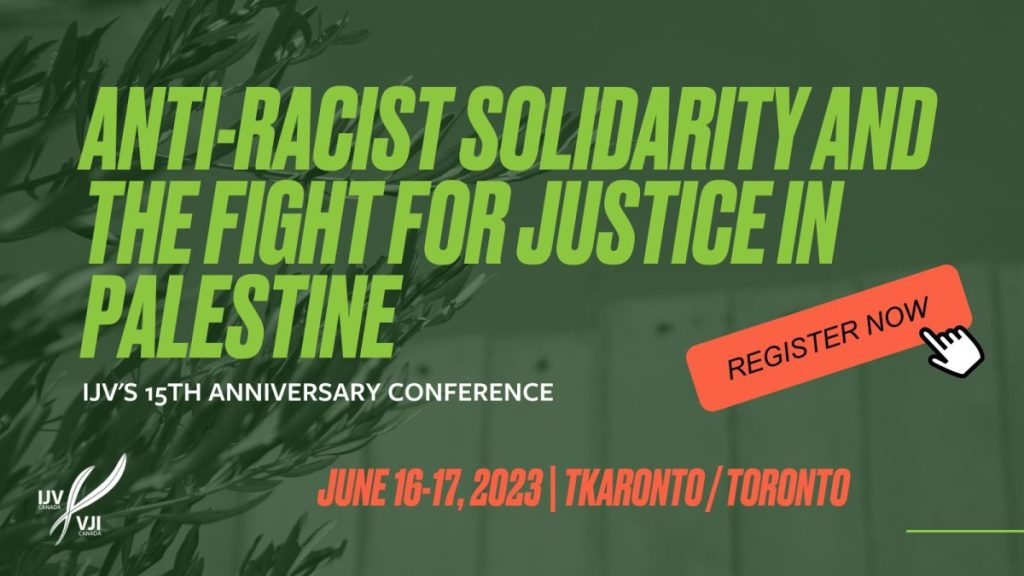 Independent Jewish Voices Canada (IJV) is thrilled to invite you to join us in Toronto from June 16 to 17 for IJV’s 15th Anniversary Conference: Anti-racist solidarity and the fight for justice in Palestine. The conference will take place Friday-Saturday followed by our 2023 IJV Annual General Meeting on Sunday, June 18. The AGM will be hybrid in-person and online with the option to join via Zoom.