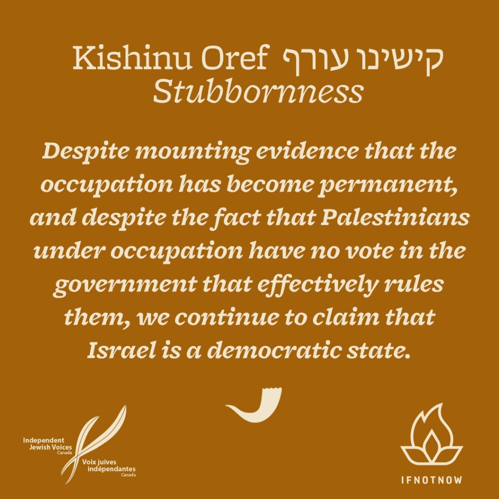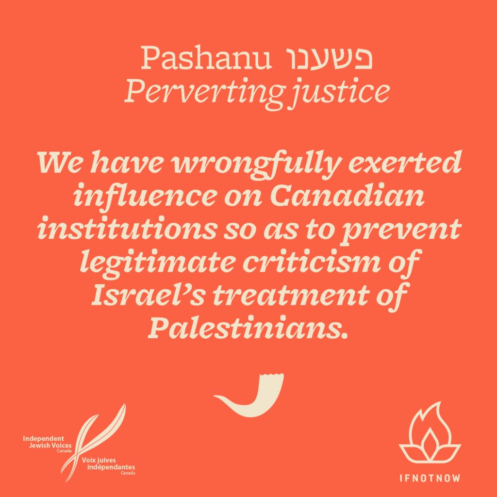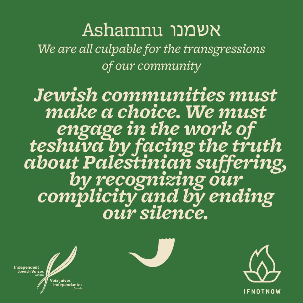 Chaque jour des dix jours de pénitence, Voix juives indépendantes Canada et If Not Now-Toronto afficheront une faute que notre communauté doit expier dans sa quête de justice et de responsabilité morale (‘héchbon néfech).