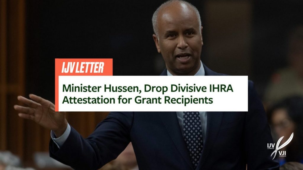 I understand that you now intend to include acceptance of the IHRA definition in Canada’s Anti-Racism Strategy as part of an attestation required of organizations that receive grants from Canadian Heritage. As an organization that takes antiracism seriously, and for whom antisemitism is an ongoing battle, we appreciate the efforts to hold organizations to account based on antiracist principles. Our fear, however, is that requiring adherence to the IHRA definition on the part of grant recipients will foster a chilling and punitive effect among Canadians, most notably members of the Palestinian, Arab and Muslim communities, not to mention others engaged in human rights and antiracism work.
