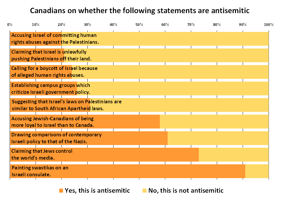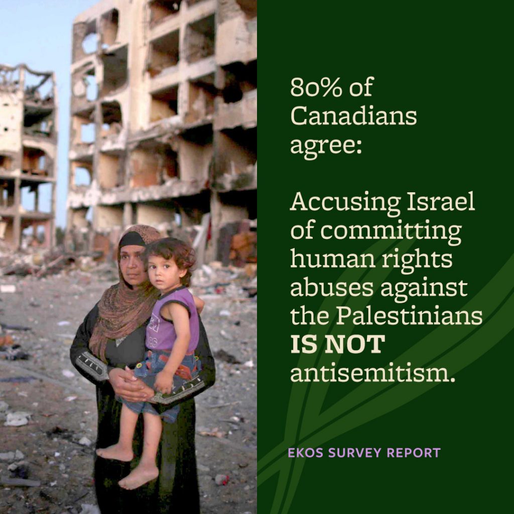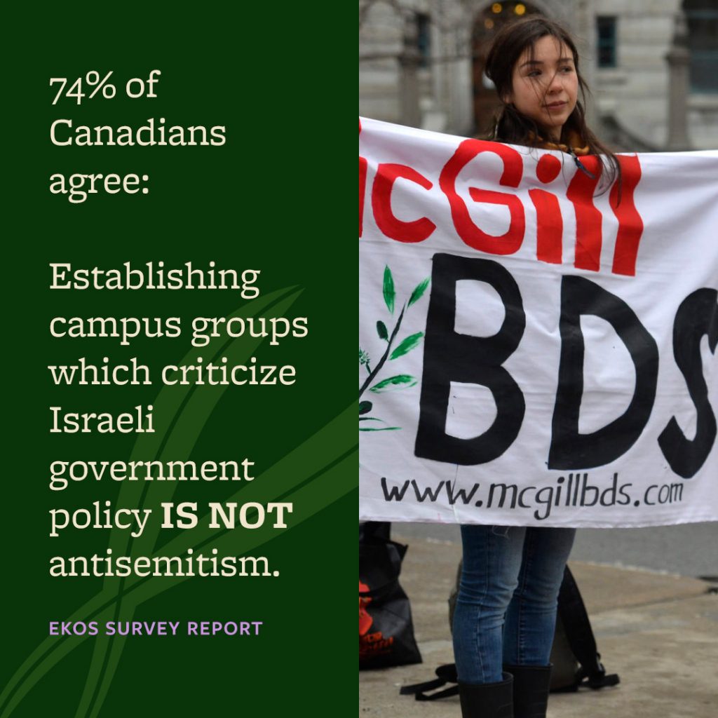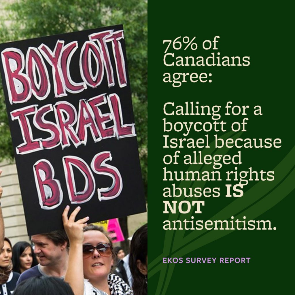 Montreal, October 7, 2020 — Newly published results from a survey conducted by EKOS Research Associates show that Canadians do not support efforts to conflate support for Palestinian human rights with anti-Jewish prejudice. The survey found that the majority of Canadians believe that criticism and protest of Israel, even when harsh, is not in principle antisemitic.