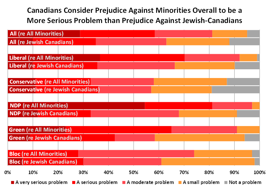 The survey also found that a majority (59%) of Canadians see prejudice against minority groups in Canada to be a serious problem, and that just over a third (35%) see prejudice against Jewish-Canadians in particular to be a serious problem. These findings point to the need to combat antisemitism as part of a holistic, intersectional approach against racism and prejudice in general, rather than passing legislation on antisemitism as if it exists in a vacuum.