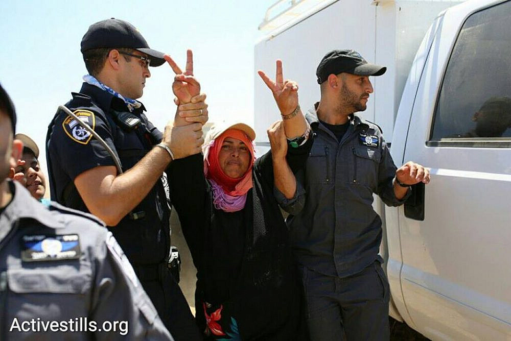 Israeli police detain a Bedouin woman during a march in the unrecognized Bedouin village of Al-Araqib, Negev Desert, July 24, 2016. (photo: Oren Ziv/Activestills.org)